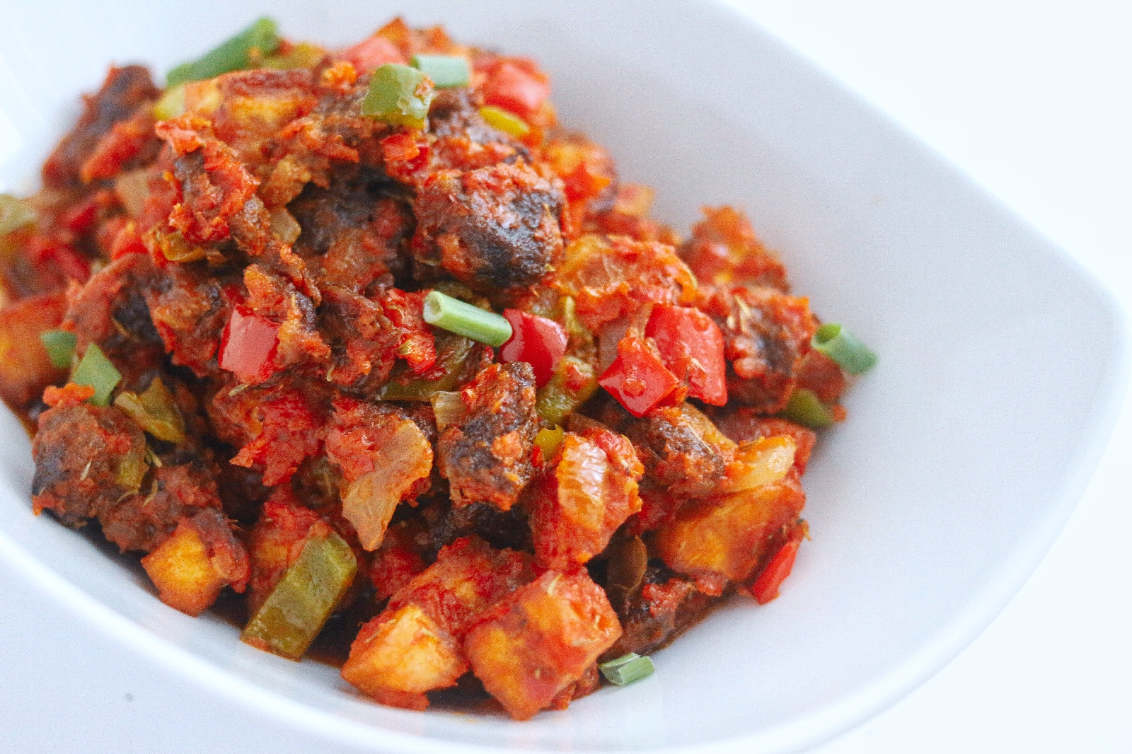 Fried plantains cooked with spicy gizzard sauce and vegetables.