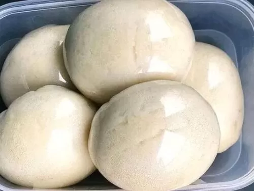 Soft and stretchy yam swallow prepared from pounded boiled yam.