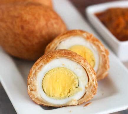 Boiled egg wrapped in seasoned meat and coated with breadcrumbs.